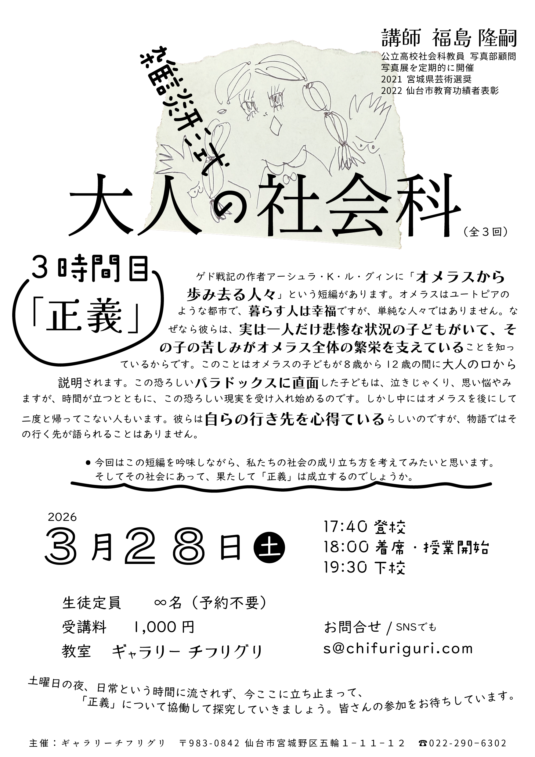 公立高校社会科教員の 福島 隆嗣 先生をお迎えして、大人になってからの耳と経験を重ねてからの視野を持って参加する、雑談形式の授業。雑談形式の大人の社会科3時間目テーマは「正義」(全3回) 今回は短編を吟味しながら、私たち...