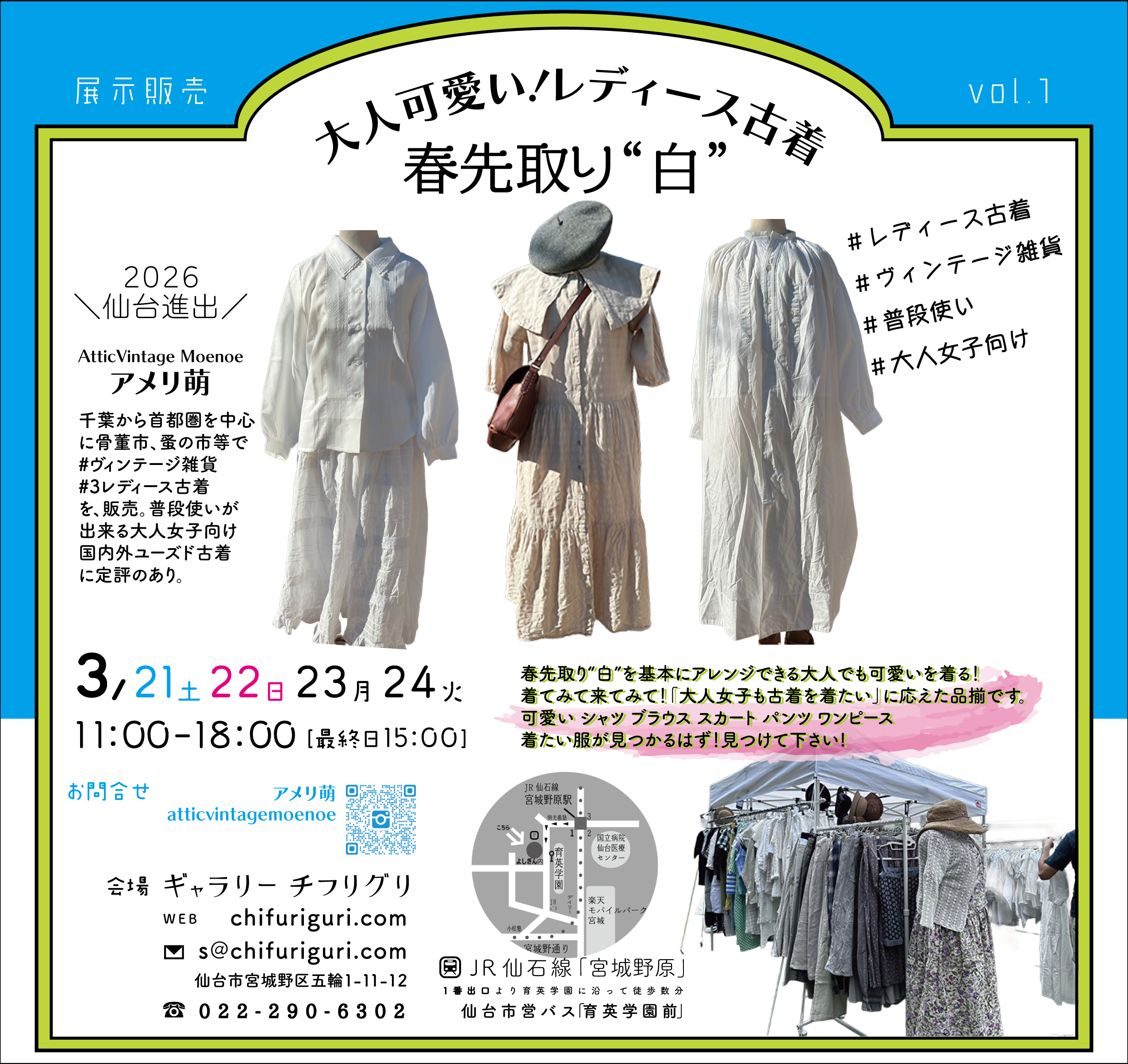 🟰仙台 初 進出🟰首都圏を中心に骨董市、蚤の市等でビンテージ古着雑貨を販売するアメリ萌さん普段使いの大人女子向け国内外ユーズド古着に定評あり。春先取りの“白”がずらりと並びます“白”を基本...
